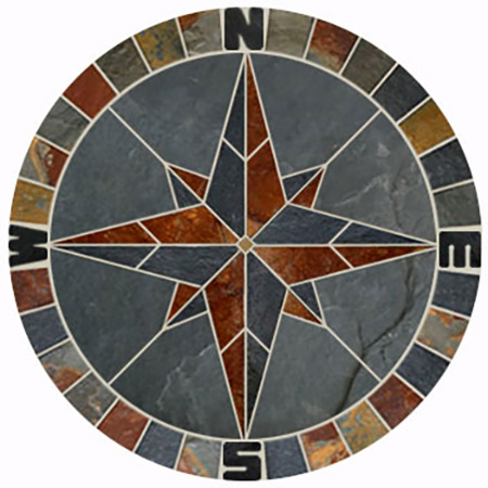 Compass style mosaic tile medallion made from beautiful and colorful natural slate. Includes hand cut NSEW directional lettering. Features an array of colors such as red-orange, natural grays, earthy browns and sage greens. Would make a gorgeous centerpiece in your tile floor or wall. You could also mount the tile medallion and use it as a wall hanging or tabletop. Suitable for indoor or outdoor use and will stand up to severe weather. Handmade in the USA by our own master tile artisan. Medallion is mesh mounted for easy installation and ungrouted. Satisfaction guaranteed or your money back!